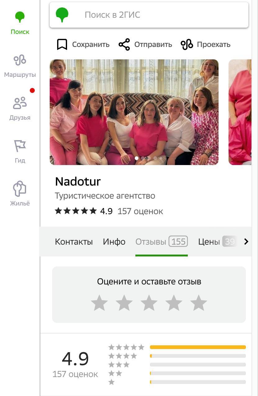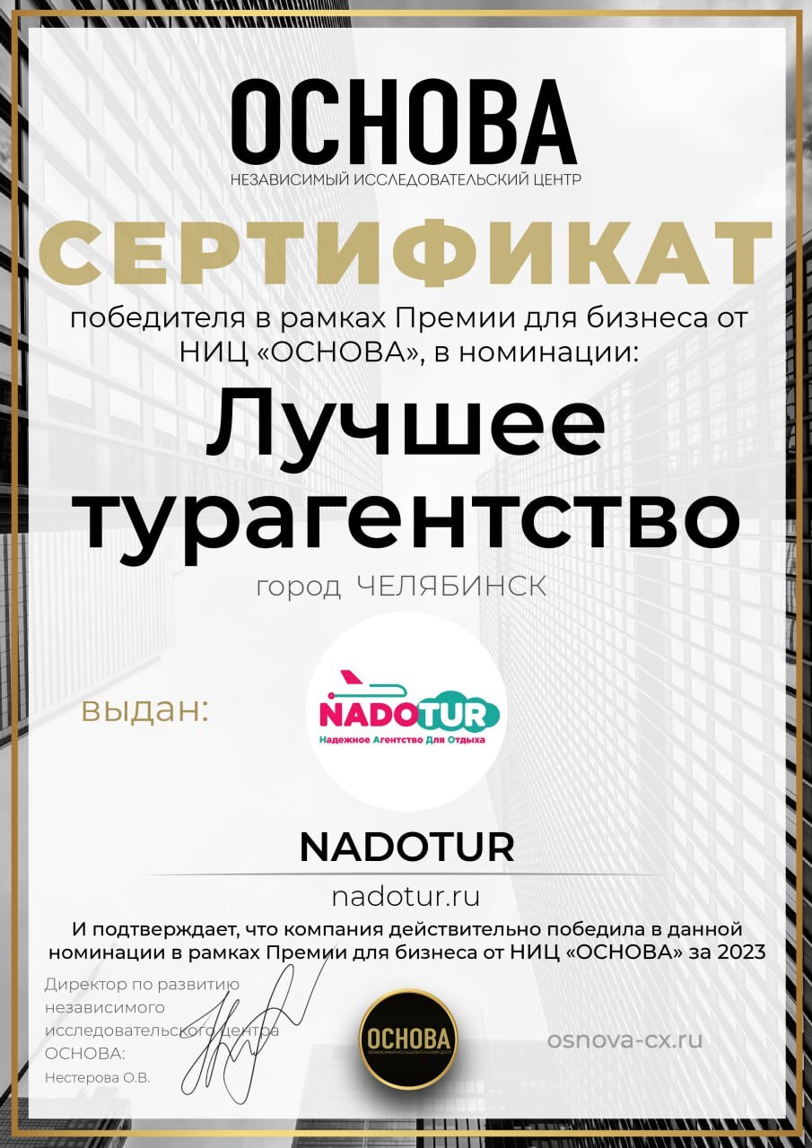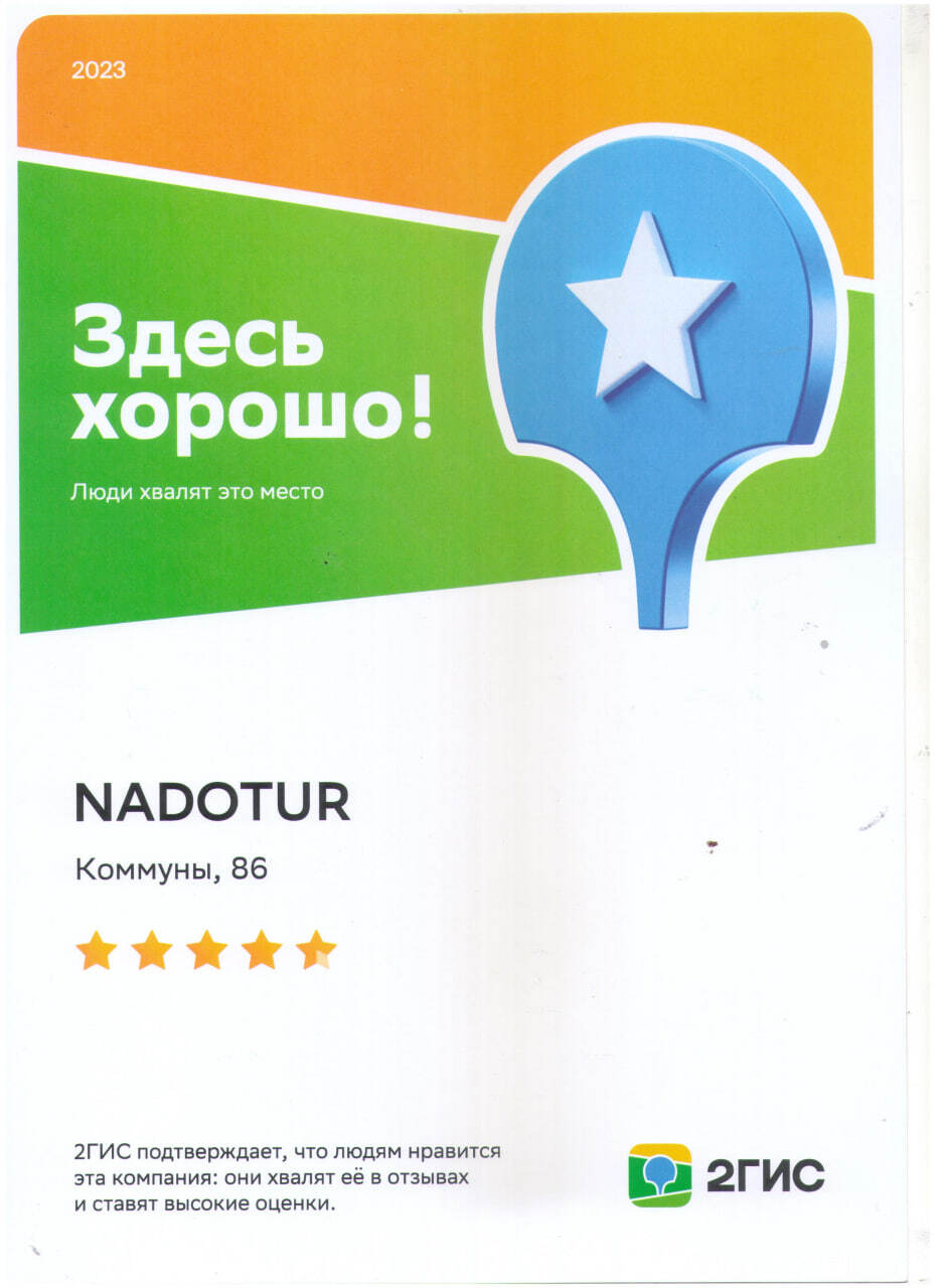 Сегодня Nadotur – это визово-туристическое агентство с 16-летней историей, прошедшее множество кризисов и пандемию. Это собственная школа агентов, где проходят обучение все менеджеры. Это готовые туры по России и зарубежным странам, а также качественный сервис и множество дополнительных услуг – бронирование отелей, авиа и ж/д билетов, страхование, визовая поддержка и многое другое.